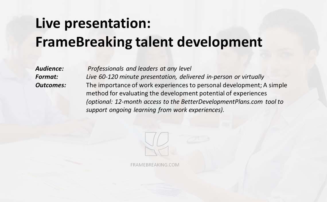 For organizations interested in applying the FrameBreaking concepts without using our structured tools, we offer short presentations on the FrameBreaking Experience Model: